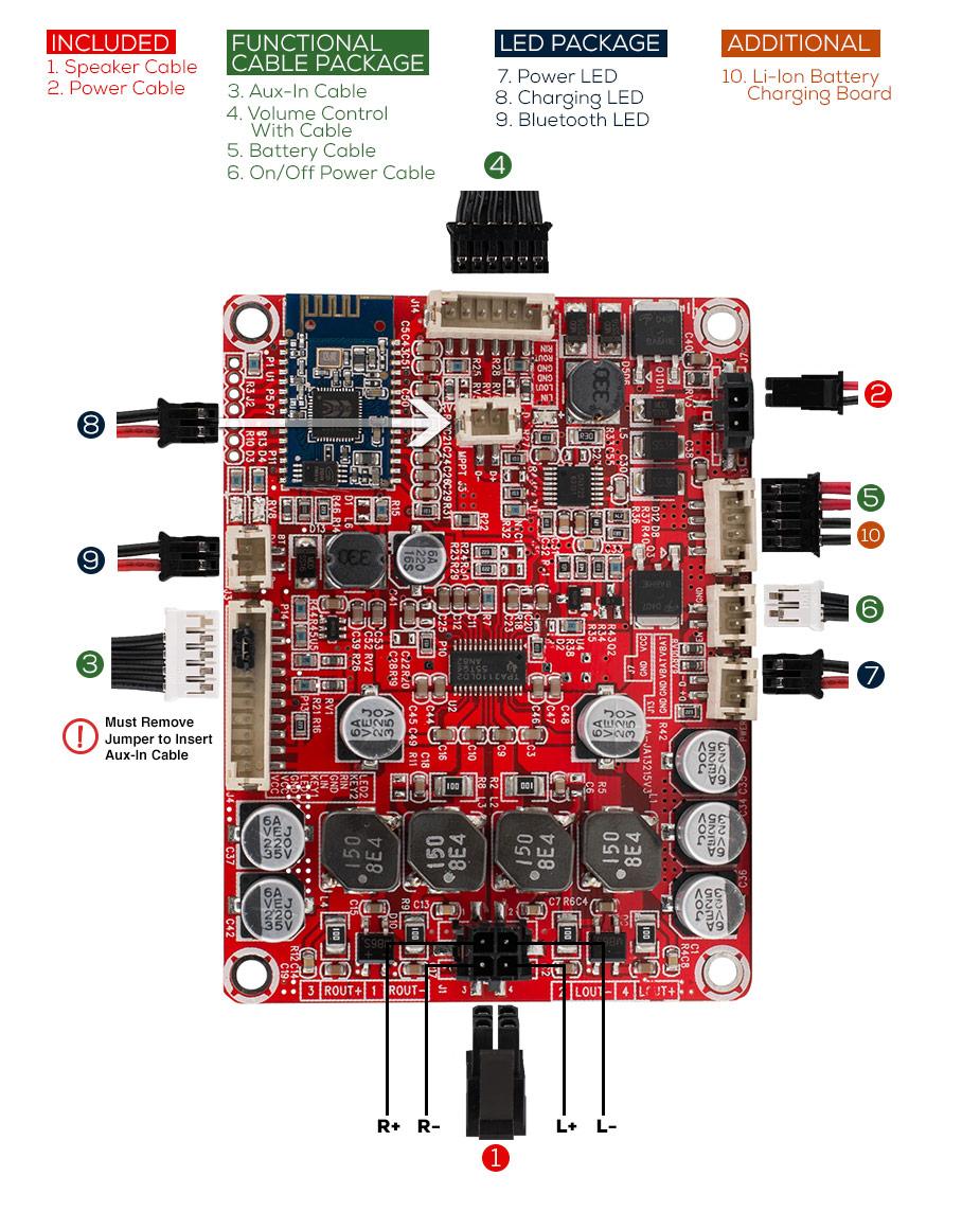 Due to the overall audio performance and built-in Bluetooth, this amp board has almost endless application possibilities. From hobbyists and DIYers to manufacturers and installation organizations this Bluetooth amp board has immense flexibility. Even if you bypass the Bluetooth feature, this amplifier board integrates easily into any job because of its array of included and optional wiring harnesses. Examples of applications include: