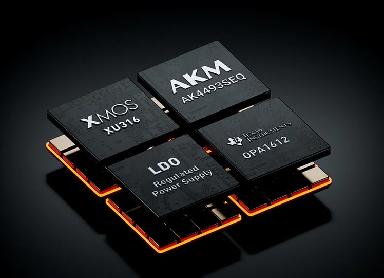 - Uses XMOS + AKM chipset with four high-performance dual op-amps for precise audio decoding