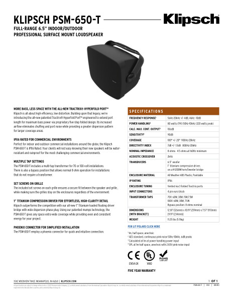 | 65 watts (16.7V) 55Hz-10kHz (260 watts peak)