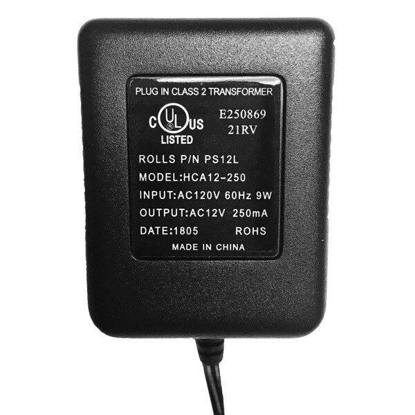 The PS12L from Rolls provides 12 volts of AC power, up to 250 mA, to devices that require low voltage alternating current. UL listed. Input voltage: 120 VAC, 60 Hz. Output voltage: 12 VAC, 250 mA. Output connector: 2.1 x 5.5 mm plug; 2 meter cord.