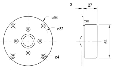 The Visaton G 20 SC is a high-end 20 mm (0.8") textile dome tweeter designed for precise high-frequency reproduction above 3,000 Hz. Its optimized dome shape and damping felt on the pole piece ensure a balanced frequency response without resonance, providing excellent omnidirectional sound distribution. The magnetically shielded design allows for integration near video equipment without interference. The powerful magnet drive and ferrofluid-cooled voice coil contribute to high efficiency and substantial power handling, making it suitable for high-fidelity audio applications.